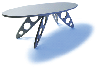 CHRÉTIEN, NO. 8 Der Entwurf dieses Clubtisches nutzt die Möglichkeiten computergesteuerter Schneideverfahren mittels Hochdruckwasserstrahl. Tischblatt und Beine lassen sich aus dem gleichen Brett mit geringstem Materialverlust herausarbeiten.